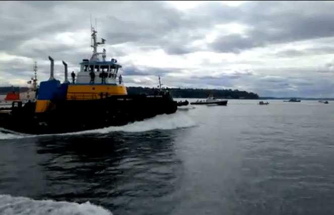 The winner of the tug race shown in the video is the Arctic Titan from Western Towboat Co. in Seattle (the tug with blue and orange colors). Harley Marine's Millennium Star, on which the video was taken, came in third in its class. The race was one of the featured events of the Vigor Seattle Maritime Festival, which also included WorkBoat's World Invitational Boatbuilding Contest & Race held last Sunday on Lake Union in Seattle.