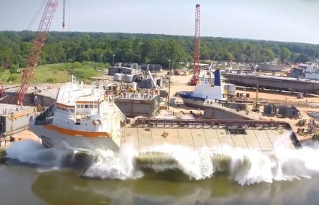 On July 31, the 201’x48’x18’, DP-2 OSV Seacor Brave was launched for Seacor Marine, one of six OSVs Seacor is building at Master Boat Builders, Bayou La Batre, Ala. The yard designed the 3,800-hp vessel and worked with Seacor on other design details. Tankage will include 5,000 bbls. of liquid mud; 4,500 cu. ft. bulk mud; and 139,758 gals. fuel. The OSV has a 144'x38', 600-LT-capacity cargo deck. The 2,031-dwt Seacor Brave will be powered by twin Caterpillar 3512C Tier 3 diesel engines, each producing 1,911 hp at 1,600 rpm. The Cats will connect to 82"x70", 5-bladed bronze propellers through Twin Disc MGX-5600 red slip clutch marine gears with 5.04:1 reduction ratios.
