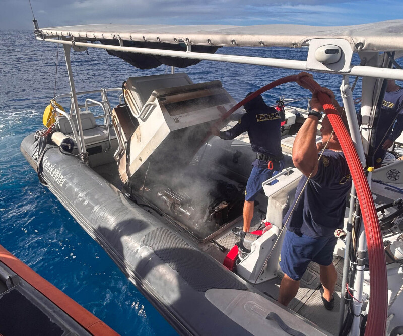 At 7:30 a.m., a 45' Coast Guard response boat arrived and began firefighting efforts using fire extinguishers and a P-6 dewatering pump. A Honolulu Fire Department rescue boat later arrived, boarded the vessel, and used the Coast Guard’s equipment to extinguish the fire in the engine compartment.