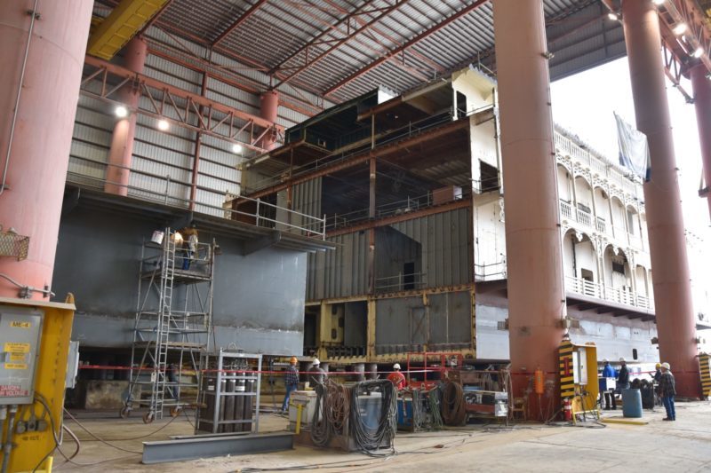 The future American Countess is matched up to its new midsection at Gulf Island Shipyards. American Queen Steamboat Co. photo