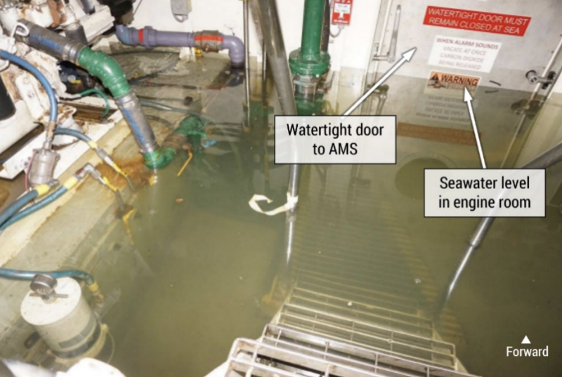 In their conclusions, investigators noted that “the lack of a bilge alarm annunciator in the accommodation spaces to alert onboard crewmembers to the flooding and a watertight bulkhead and watertight door that did not prevent progressive flooding” contributed to incident.