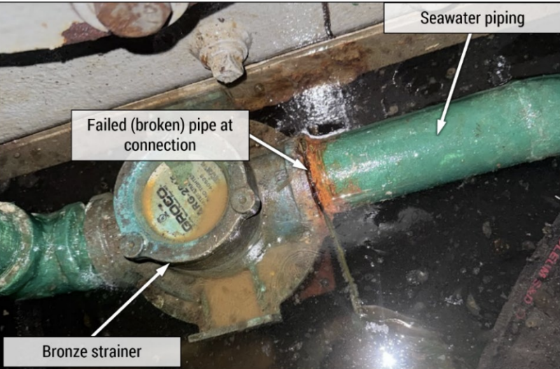 The NTSBU summarized its findings as “a failed seawater cooling supply pipe for a diesel engine–driven generator due to corrosion. Contributing to the extent of the damage was the lack of a bilge alarm annunciator in the accommodation spaces to alert onboard crewmembers to the flooding and a watertight bulkhead and watertight door that did not prevent progressive flooding.”