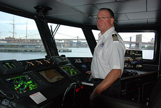 Molly Pitcher’s bridge has an integrated Furuno display that includes, radar, GPS and charts, and FLIR thermal imaging. Kirk Moore photo.For her operators, Molly Pitcher has been a pleasure to run. At the helm are Jastram Digital electric over hydraulic controls, with a dampening effect on shifting to gently ease in and out of terminal slips. An integrated Furuno electronics suite includes a center display that shows radar, GPS and chart information, and FLIR thermal imaging.