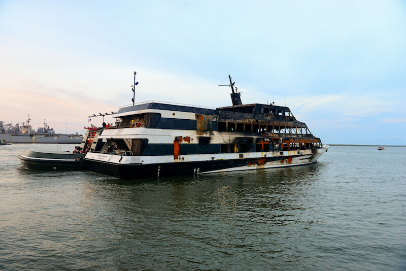 The 187’ Spirit of Norfolk was towed to Pier 4 at the Navy station, where the base’s Fire and Emergency Services were soon joined by units from Norfolk, Coast Guard Sector Virginia and nearby cities of Chesapeake, Hampton, Newport News, Virginia Beach and Portsmouth, according to Navy and fire officials.