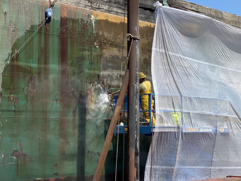 By using a UHP water blasting system ESR is reducing impact on the environment and the health and safety of personnel, yard officials said. Water blasting is an environmentally responsible process that produces no air pollution and creates significantly less waste disposal over solid grit blasting. When water blasting is performed, the water is reclaimed through a separation system and leaves an inert and non-hazardous sludge behind for disposal. Whereas sandblasting generates significant amounts of spent material consisting of paint-chips, silica, and potentially heavy metals. Additionally, the water blasting creates less noise compared to sandblasting and mechanical methods of coatings removal, ESR officials said.