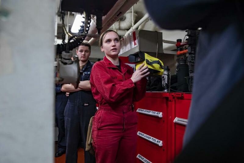 Location: Tyrrhenian Sea. Damage Controlman 3rd Class Hannah Tessier, from Fryeburg, Maine, assigned to the Nimitz-class aircraft carrier USS George H.W. Bush (CVN 77) demonstrates how to use a thermal imager, Dec. 6, 2022. The George H.W. Bush Carrier Strike Group is on a scheduled deployment in the U.S. Naval Forces Europe area of operations, employed by U.S. Sixth Fleet to defend U.S., allied and partner interests.