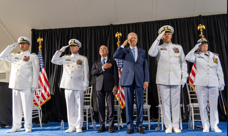Adm. Karl L. Schultz was relieved as commandant of the U.S. Coast Guard by Adm. Linda L. Fagan during a military change-of-command ceremony presided over by President Joseph R. Biden on Wednesday at Coast Guard headquarters.