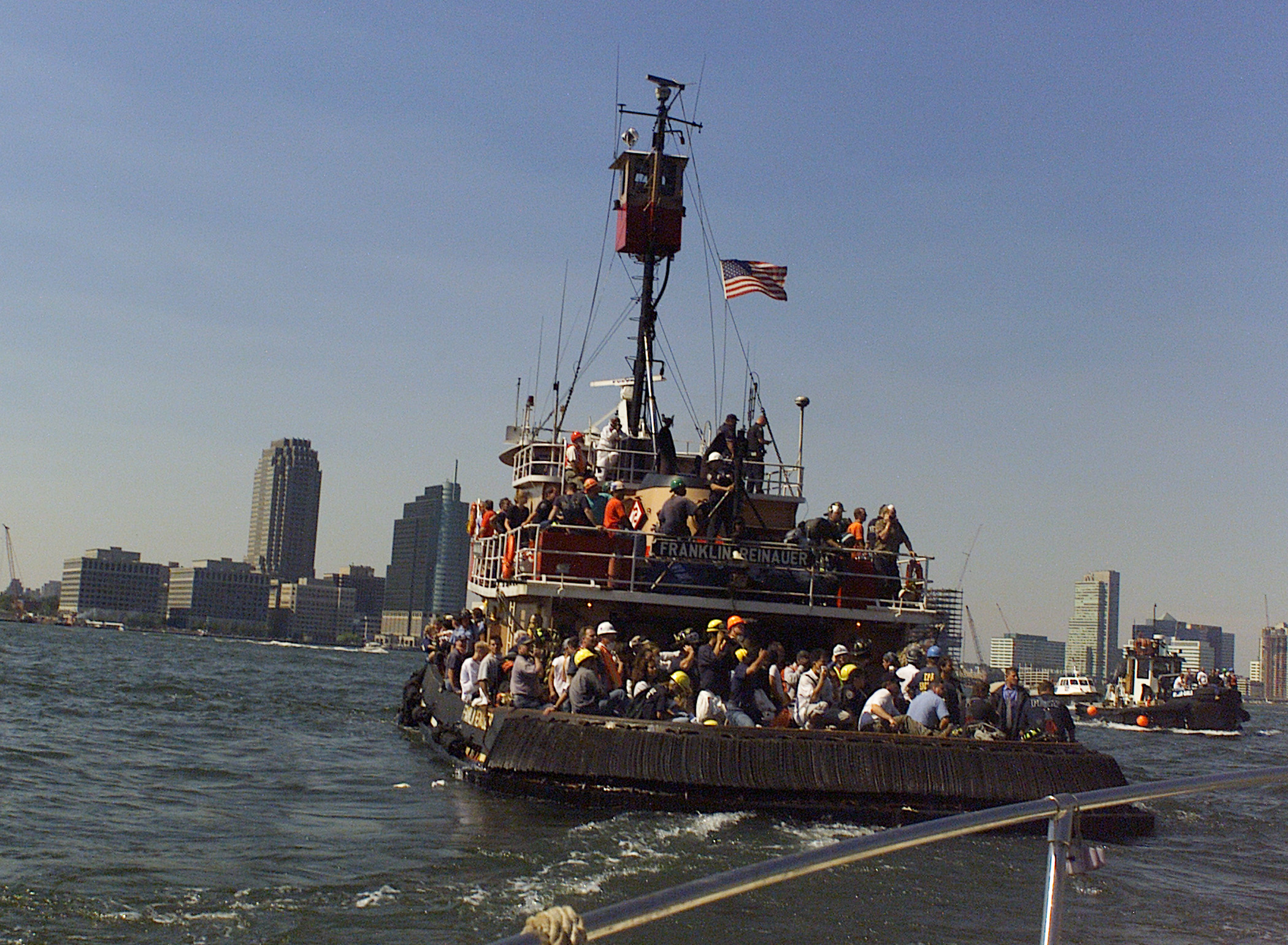 But another group of “rescuers” also played an important role that terrible day: commercial mariners. The terrorist attack that left thousands dead also left many of the shocked survivors trapped at the southern tip of Manhattan Island. In their time of need, marine personnel who make their living in and around New York Harbor responded with everything they had. The Coast Guard estimated that about one million people were evacuated from Manhattan by all of the combined marine resources.