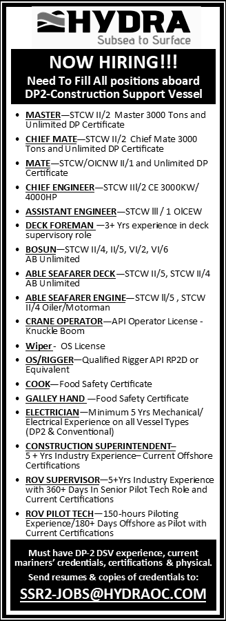 Must have DP-2 DSV experience, current mariners’ credentials, certifications & physical.