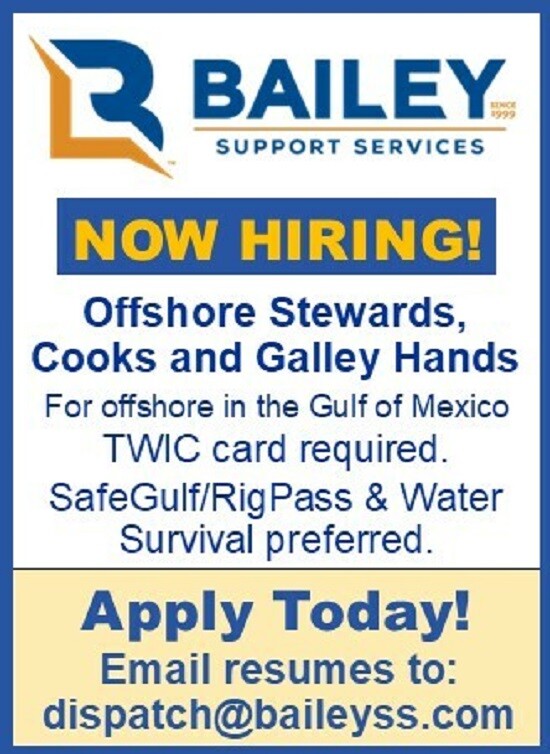 NOW HIRING! Offshore Stewards, Cooks and Galley Hands