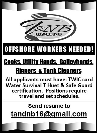 Cooks, Utility Hands, Galleyhands, and Riggers are needed for offshore positions. A TWIC card is needed, as well as Water Survival T Huet and Safe Gulf certification. The positions require traveling and working set schedules.