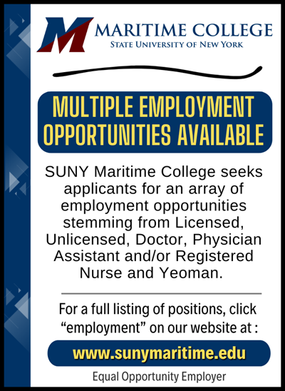 SUNY Maritime College seeks applicants for an array of employment opportunities stemming from Licensed, Unlicensed, Doctor, Physician Assistant and/or Registered Nurse and Yeoman.