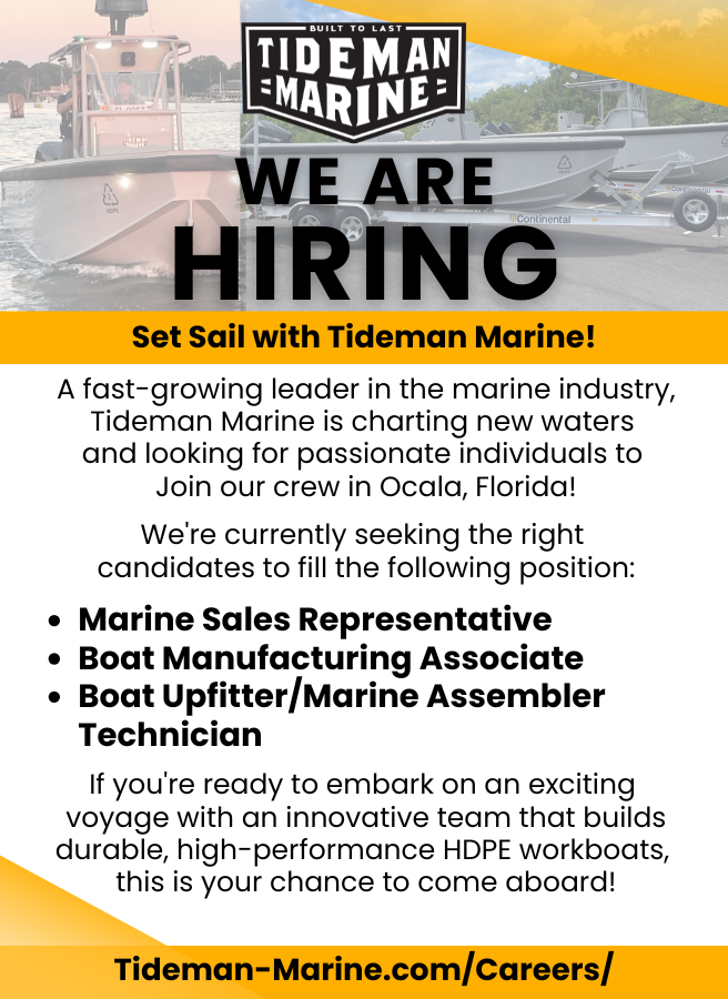 Tideman Marine is currently seeking a Marine Sales Representative, Boat Upfitter/Marine Assembler Technicians and Boat Manufacturing Associates.