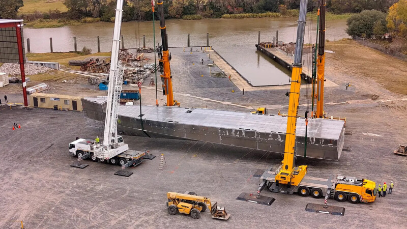 Saronic Technologies, Austin, Texas, this week completed the hull flip of its first Marauder uncrewed surface vessel at its shipyard in Franklin, La.
