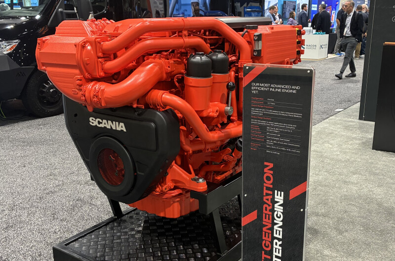 “This engine is sustainability focused,” said Ernie Ortega, marine sales manager for Scania’s U.S. headquarters in San Antonio, Texas.