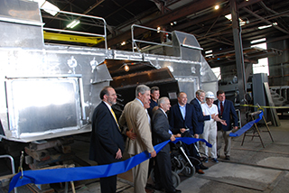 A crowd of more than 100 supporters showed up at Blount Boats in Warren, R.I. Wednesday for a ribbon cutting on the first crew transfer vessel to be built for the nascent American offshore wind power industry.