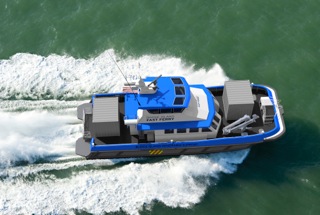 Propulsion will be provided by two 1,400-hp MAN V12-1400 engines, ZF Marine 3050 gears, and Hamilton Jet HM571 waterjets. The vessel is expected to hit speeds over 28 knots, cruise (80% power) at 27 knots light and 23 knots loaded.