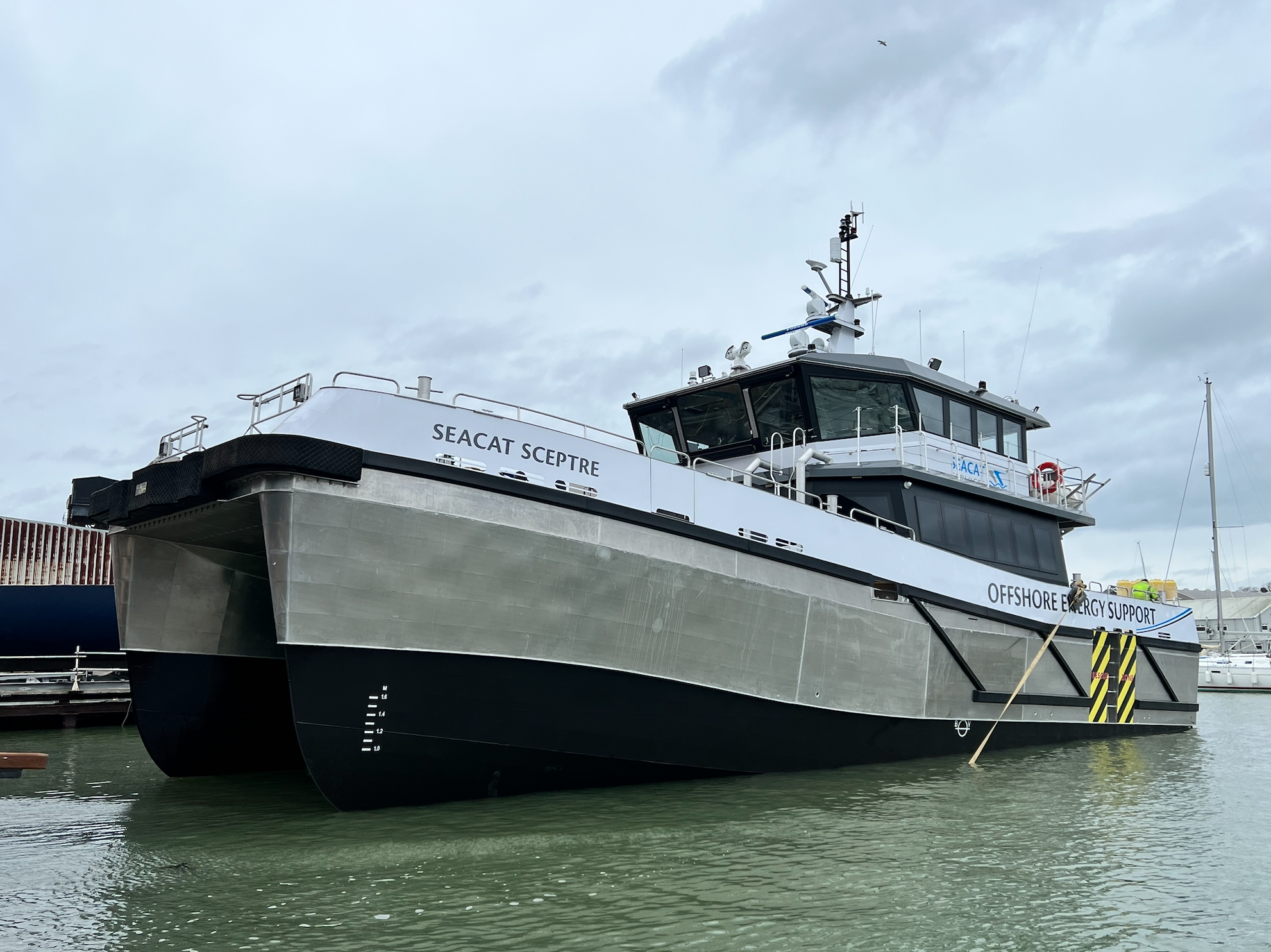 The Chartwell Seacat Sceptre, built at the Diverse Marine yard in Cowes, Isle of Wight, for offshore wind energy service operator Seacat Services, is undergoing sea trials.