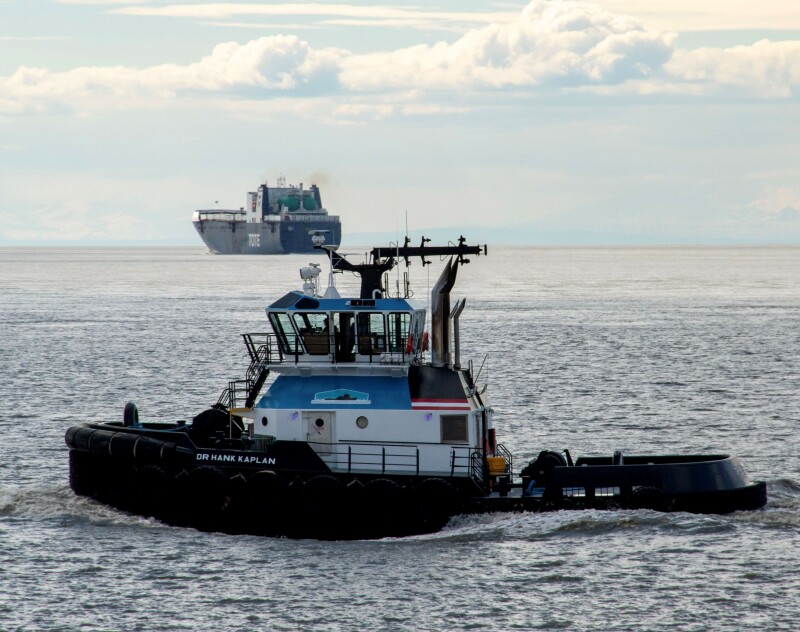 The Dr Hank Kaplan is homeported in Anchorage, Alaska, and painted with the recognizable blue and white colors of Cook Inlet Tug & Barge.