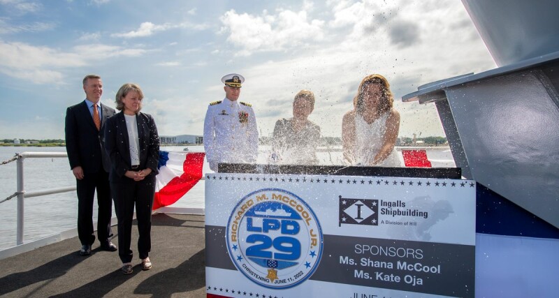 “For nearly two decades, we have had the opportunity to build these amphibious ships, and we look forward to continuing this journey with such a valued partner,” Ingalls Shipbuilding President Kari Wilkinson said during the christening ceremonies. “Today we reflect on Richard M. McCool Jr.’s bravery and heroism in front of a ship that will carry another generation of brave sailors and Marines into missions defending our freedom.”