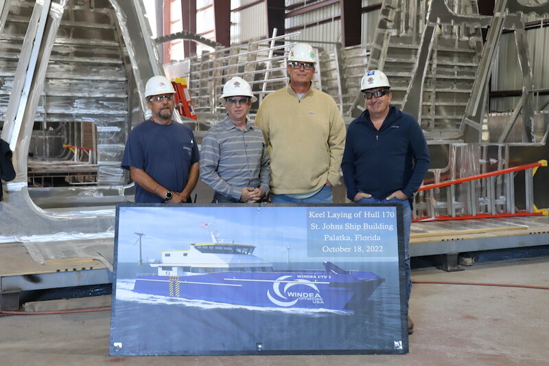 “We are pleased to reach the point of our second Windea keel laying. Our team will continue SJSB’s crew transfer vessel construction program in covered work areas with the direct support of Incat and the oversight by Hornblower,” Jeff Bukoski, president of St. Johns Ship Building, said in his remarks. “We remain focused on infrastructure improvements that will contribute to the quality and efficiency of our aluminum and steel vessel programs required to support offshore wind developments.”