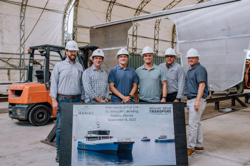 St. Johns Ship Building, Palatka, Fla., held a keel laying ceremony earlier this month for the first of a series of 82' aluminum crew transfer vessels (CTVs) for Atlantic Wind Transfers.