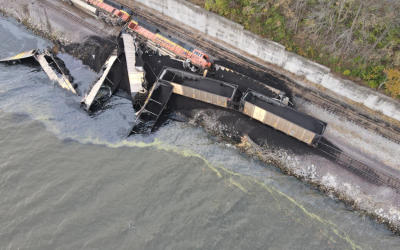 Then the Baxter Southern’s pilot saw the light of an approaching train and attempted to move the tug and tow away from the riverbank, while the train’s engineer activated the emergency brake. But it was too late to avoid the forward barge, which was a foot over the railroad ties. When the barge and train met, both locomotives and 10 hopper cars loaded with coal derailed. Six hopper cars ended up in the river.