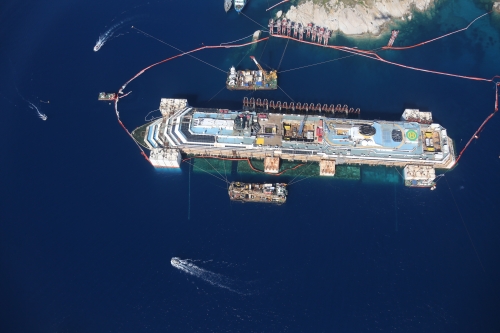 Preliminary activities for Costa Concordia departure maneuvers began at 6 a.m. The first step was to disconnect the mooring cables that connecting the Costa Concordia to the towers on the shore.