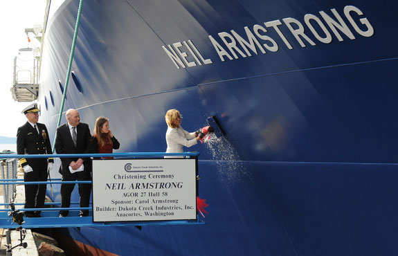 A christening ceremony for the 238'x50' oceanographic research vessel AGOR 27, named in honor of Neil Armstrong, was held at Dakota Creek Industries (DCI) in Anacortes, Wash., on March 29, 2014. The Neil Armstrong is mono-hull research vessel designed by Guido Perla & Associates that will be capable of integrated, interdisciplinary, general purpose oceanographic research in coastal and deep ocean areas.