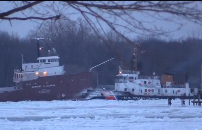In this video, Canadian and U.S. Coast Guard work to free the bulk carrier Herbert C. Jackson that was stuck in the ice near Algonac, Mich. The vessel was one of five freighters that became trapped in the icy waters of the St. Clair River this weekend.