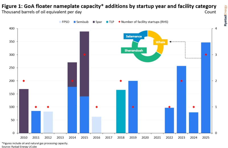 The Gulf has in many ways come full circle since the price crash that rattled the industry a decade ago, with the floaters of 2025 adding nearly 350,000 boepd of nameplate processing capacity (Figure 1). This represents the highest capacity additions since 2015, when Anadarko Petroleum brought the Heidelberg and Lucius truss spars on-line and LLOG fired up its Delta House FPU in the Mississippi Canyon.