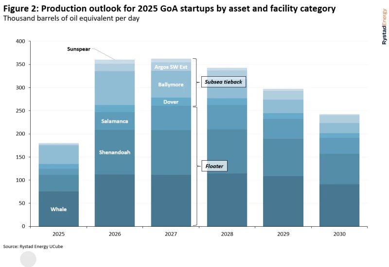 All in all, the peer group of 2025 Gulf of America startups is set to add 350,000 boepd in 2026-2027, with new FPU projects accounting for around 70% of total near-term volume (Figure 2). Arguably more significant is that the class of 2025 is forecast to account for between 15% and 18% of total U.S. deepwater output, representing the highest sustained production contributions from a single startup year since 2009.