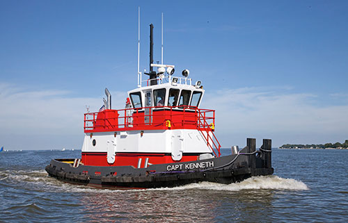 The boat, designed for both towing and pushing barges, has a model bow and push knees so it can operate in any part of the Chesapeake in most sea conditions.