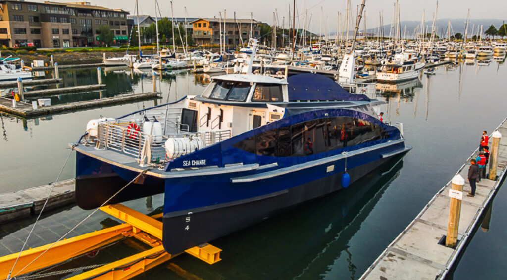 The 72' aluminum catamaran Sea Change is the first commercial hydrogen-powered fuel cell vessel to be delivered in the U.S. (Delivery was scheduled for October.)