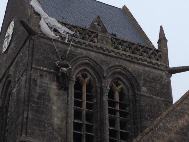 In the early morning, just hours before the Allied landings, a bomb exploded in a house just off the village square, sending the church bells into action and awaking the occupying German garrison that ordered a bucket brigade of local residents to stop the raging inferno. The fire illuminated the surrounding sky, making perfect targets of paratroopers as they floated toward the ground. German soldiers killed many of them when their chutes got tangled on utility poles or in trees, while a few were drawn into the fire. Steele’s parachute caught on the steeple of the church located in the square, and hanging there helpless, with a bullet in his foot, he watched the carnage unfold below.