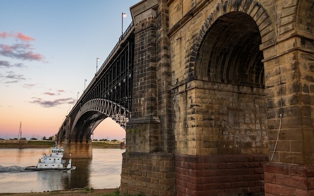 Capt. John O. Johnson used full power going under the bridge, making about 3 mph against a stiff current. About 800' of the tow cleared the bridge before the tow abruptly stopped. The Anne Holly’s engines continued at full power, but the tow stalled, the current pushing the tow into the center span of the bridge on the Missouri side.