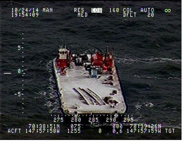For the safety of the crew during the storm, the tug continued on without the unmanned barge, which drifted west into U.S. waters. As of Monday, the barge was drifting toward Arctic sea ice north of Prudhoe Bay, according to Coast Guard commander Shawn Decker.