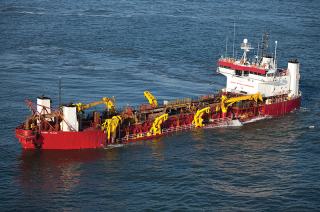 Great Lakes has the first of three dredges, the 281'x53'x19'6" Padre Island working about two miles offshore, pumping sand onto the Ship Bottom beach.