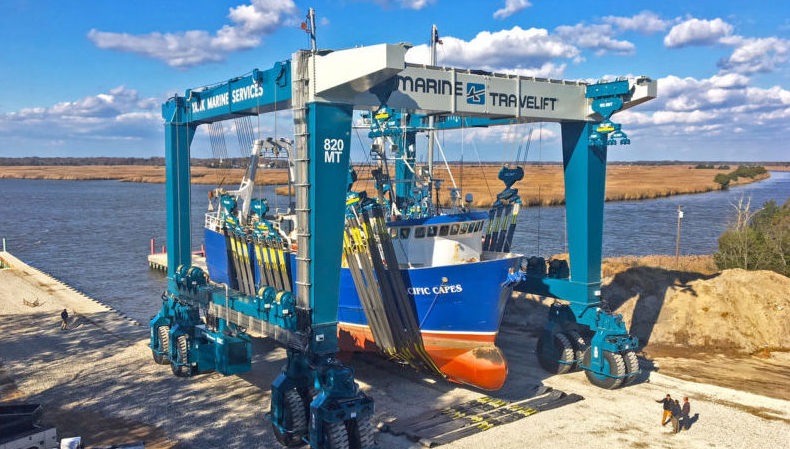 Within a few years, owners John and Bette Jean Yank traded in the old 200-ton machine to Marine Travelift as part of a $3.8 million lease of an 820-ton boat hoist. Arriving in late 2017, the lift’s first jobs included the 74.5’x25’x11.7’, 2,000-hp tug Petrel, and the 91.3’x36’x14.8’ Pacific Capes, a former Alaska crab vessel that had been acquired by a fishing company in Cape May, N.J.