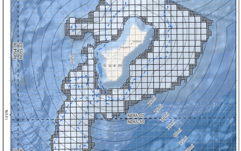 The call document requests information on one contiguous area around the island of about 2.1 million acres, beginning 3 nautical miles from shore at its closest points, in water depths ranging from approximately 350 to 2,200 meters (1,148’ to 7,217’). Information on the potential Guam call area is already published online at BOEM’s Guam webpage.