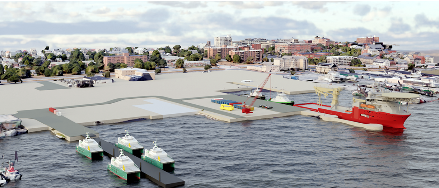 A rendering from Foss Marine’s parent corporation Saltchuk shows a planned layout with berths for crew transfer vessels, or CTVs, built for fast commutes of technicians out to wind turbines, and bigger service operations vessels, or SOVs, that would stay on station at sea amid wind turbine arrays.