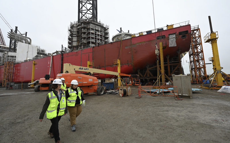 Steve Feldgus, Interior’s principal deputy assistant secretary for land and minerals management, Bureau of Ocean Energy Management Director Elizabeth Klein and Bureau of Safety toured the 472’ vessel at the Seatrium AmFELS shipyard.