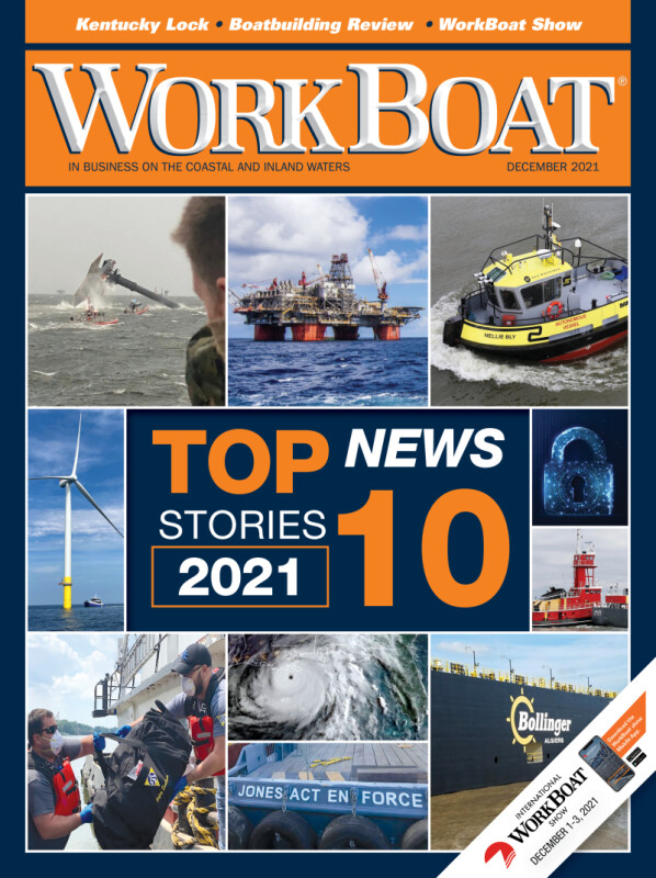 Cover Story: The 10 top workboat industry stories of 2021. • A funding boost has pushed the Kentucky Lock Addition Project closer to completion. • Coverage of the 41st International WorkBoat Show to be held in New Orleans from Dec. 1-3, 2021. • Boatbuilding Review: Highlights of the boats that appeared in WorkBoat from December 2020 through November 2021... and more!